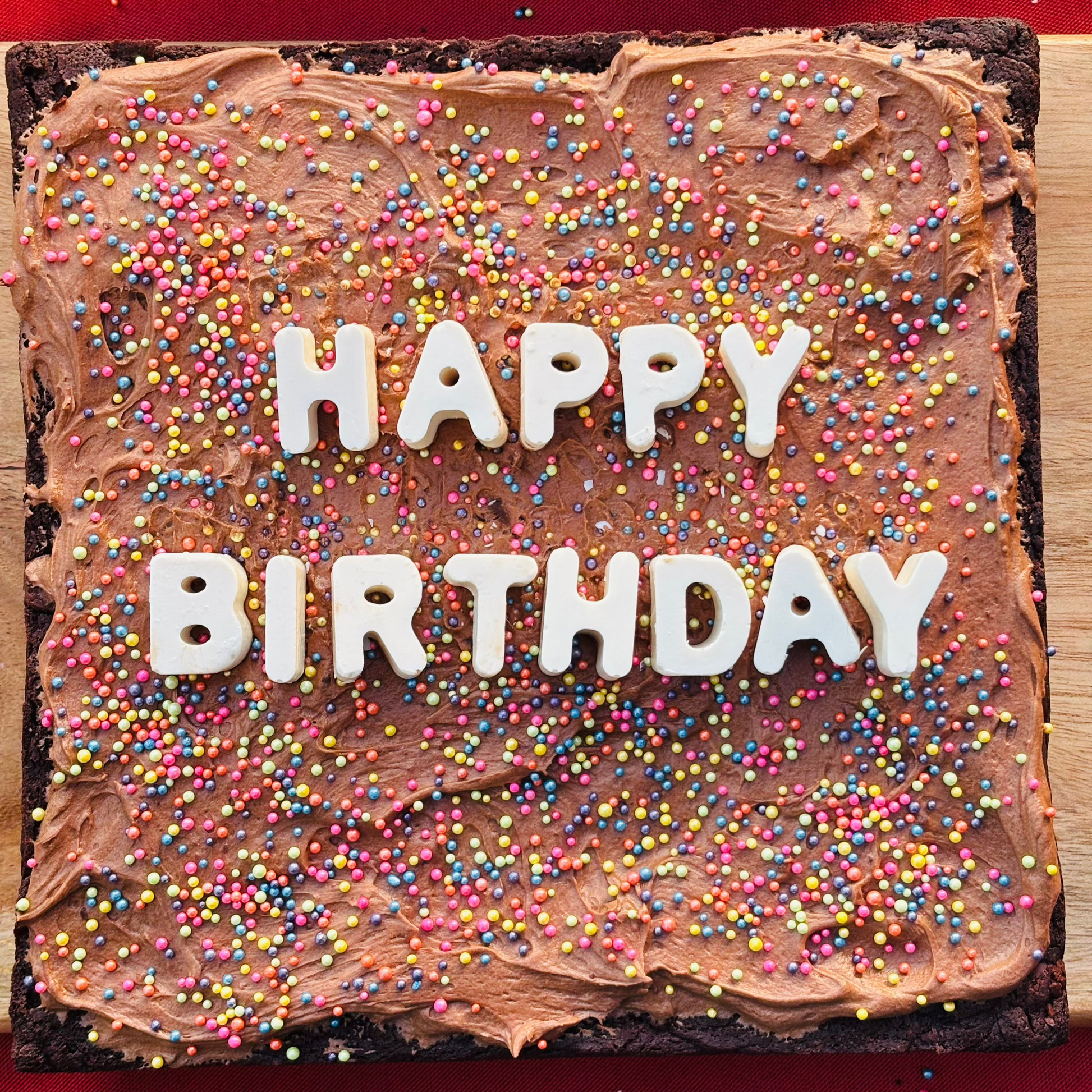 Create your own brownie with toppings, and a personalized message made from chocolate letters.